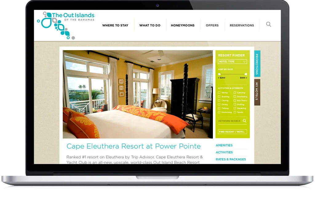 The Out Islands website was designed to allow visitors to build a vacation experience based on budget, nearby activities and special promotion packages from over fifty resorts and hotels, including Ritz Carlton, Four Seasons and a number of beachfront boutique hotels.